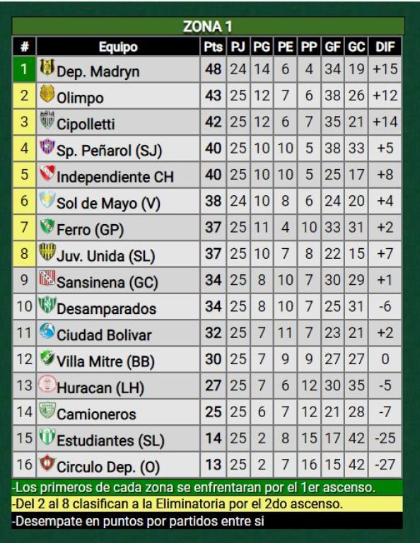 Por el lado de Olimpo, pese a la derrota se mantiene como escolta de Deportivo Madryn con 43 unidades, aunque desperdició la chance de achicar la diferencia con el puntero, que perdió 1-0 con Ciudad Bolívar como visitante y sigue liderando con 48.