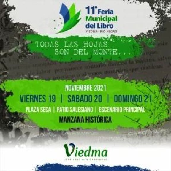 El 19 de noviembre comenzará la Feria del libro “Todas las hojas son del monte”. Se trata de una iniciativa de la Municipalidad de Viedma y que tendrá lugar en Viedma, en la Manzana Histórica y plaza Alsina.