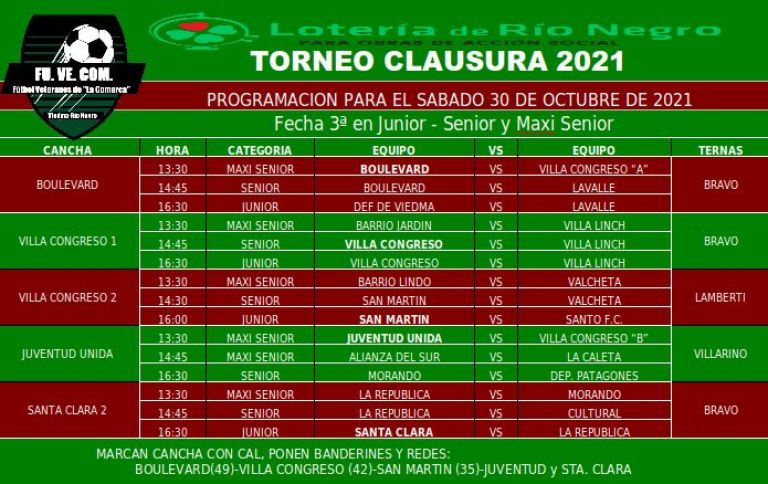 Boulevard, Villa Congreso, Juventud Unida y Santa Clara serán los escenarios de la tercera fecha de los torneos que lleva adelante Fu.Ve.Com para las categorías maxi senior, senior y junior.