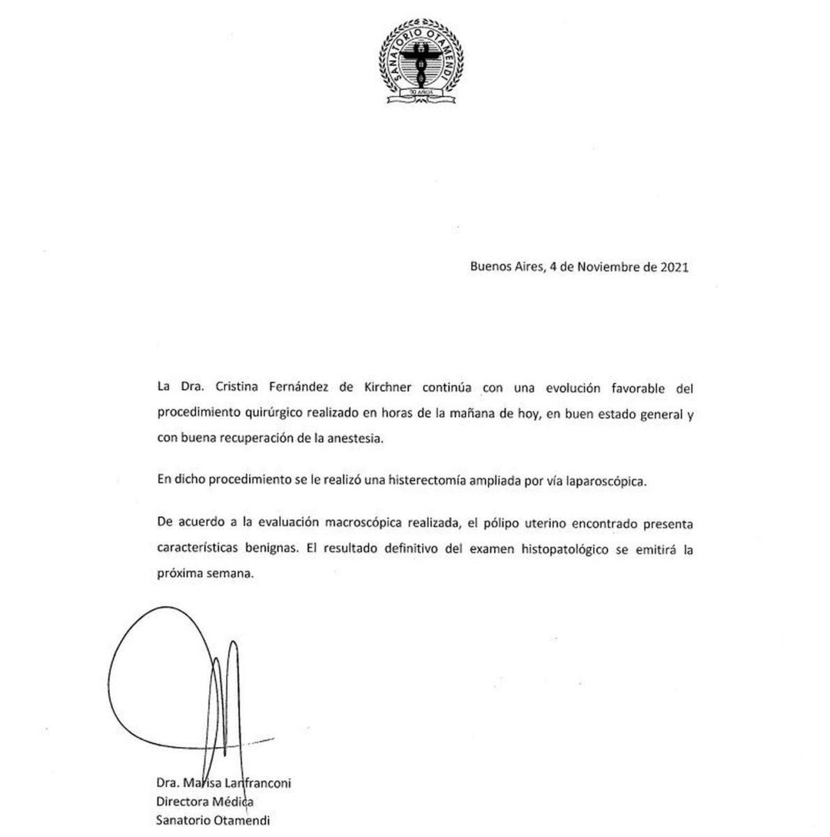 El comunicado fue publicado por el sanatorio Otamendi, donde se informó el estado de salud de la Vicepresidenta.