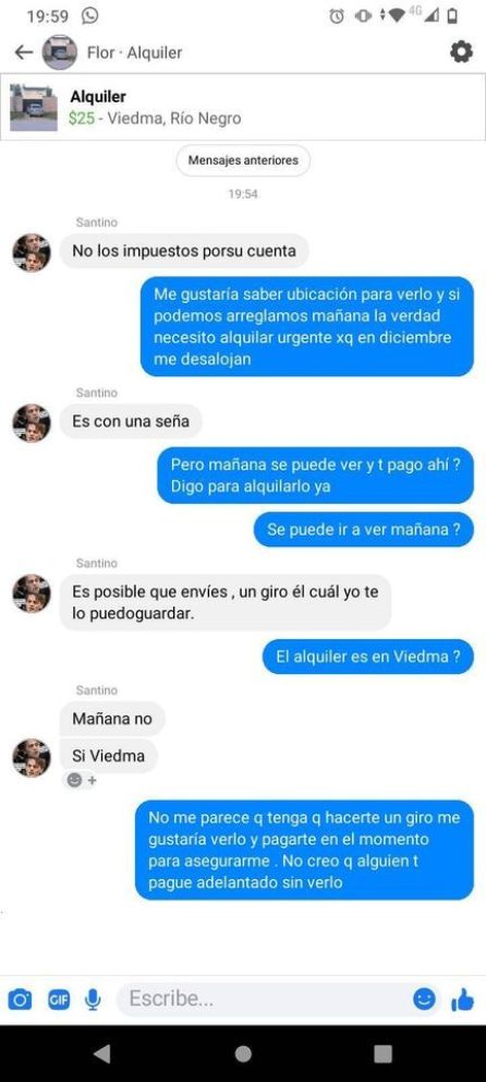 Una vecina de Viedma compartió a través de Facebook el dialogo con un supuesto locatario que intentó estafarla. Poco a poco, con el transcurso de la conversación se evidencia que se trata de que algo no está bien. En primer lugar, cuando le preguntan sobre la ubicación del inmueble evade la pregunta.