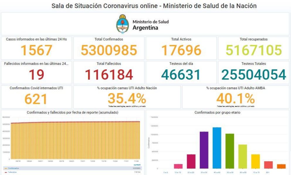 Según el informe del Ministerio de Salud de la Nación, en las últimas 24 horas el número total de contagios desde el comienzo de la pandemia ascendió a 5.300.985, en tanto que los fallecimientos se ubican en 116.184.