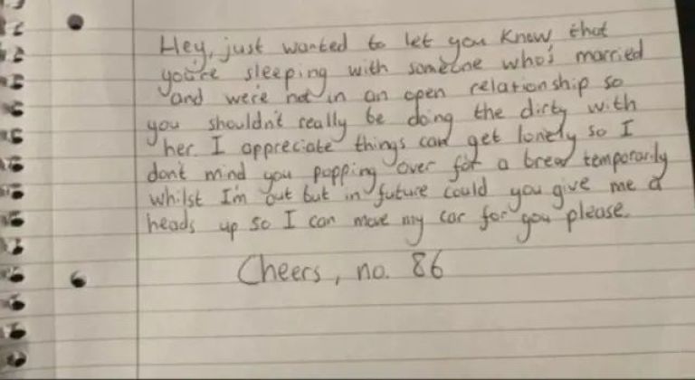 "Entiendo que te sientas solitario a veces, así que no me importa que vengas a tomar una cerveza de vez en cuando mientras estoy fuera, pero en el futuro podrías avisarme para que pueda mover mi coche para que puedas estacionar, por favor, saludos", prosiguió en la misiva que generó un revuelo en las redes sociales.