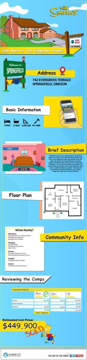 Allí, estimaron que la construcción se realizó en 1989, se extiende por 2200 pies cuadrados (unos 200 metros cuadrados), tiene dos pisos, cuatro dormitorios y dos baños. Aunque los protagonistas, Homero, Marge, Bart, Lisa y Maggie, viven sus aventuras muchas veces fuera de su hogar, siempre terminan volviendo a esta casa, que también se llevó muchos flashes en tantos años de episodios. Por ejemplo, el hermano malvado de Bart estaba encerrado en el ático o incluso las míticas imágenes de la familia mirando televisión o de Homero “empilchado” con un smoking negro, que dieron lugar a decenas de memes.