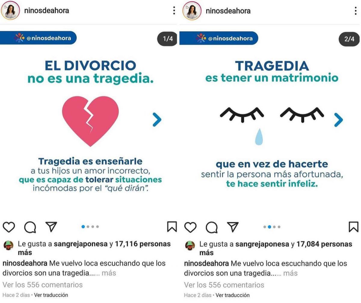“El divorcio no es una tragedia. Tragedia es enseñarles a tus hijos un amor incorrecto, que es capaz de tolerar situaciones incómodas por el ‘qué dirán’. Tragedia es tener un matrimonio que en vez de hacerte sentir la persona más afortunada te hace sentir infeliz”, se lee en una de las imágenes.