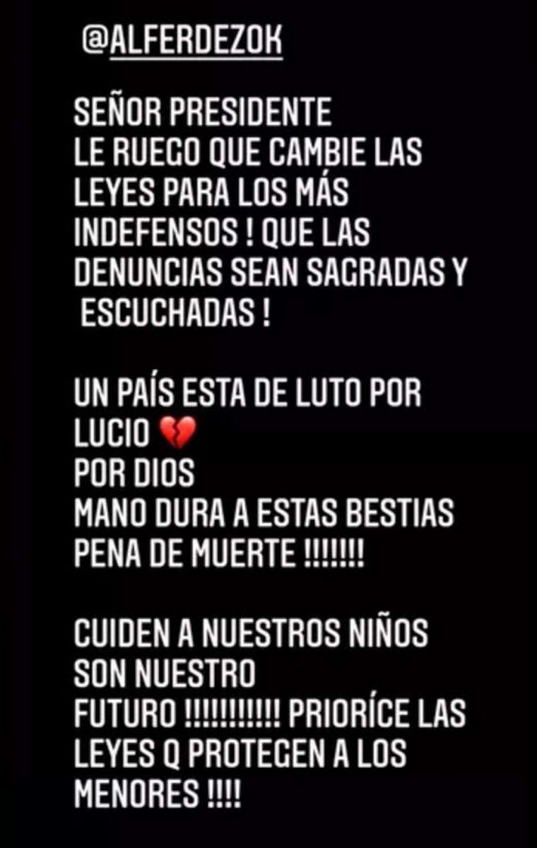 Ya antes de su confrontación con Ofelia Fernández, la mediática había publicado un mensaje pidiendo al presidente penas más duras para quienes cometen crímenes contra los niños. “Señor presidente le ruego que cambien las leyes para los más indefensos, que las denuncias sean sagradas y escuchadas”, manifestó. “Mano dura a estas bestias. Pena de muerte” declaró de forma contundente haciendo referencia al asesinato de Lucio.