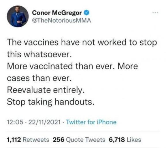 Esta no es la primera vez que Conor McGregor se muestra crítico con las vacunas. El pasado 22 de noviembre se despachó a gusto asegurando que "las vacunas no han funcionado para detener esto en absoluto. Más vacunados que nunca. Más casos que nunca. Reevaluar por completo. Dejen de aceptar limosnas", un tuit que borró de forma casi inmediata pero que hemos recuperado.