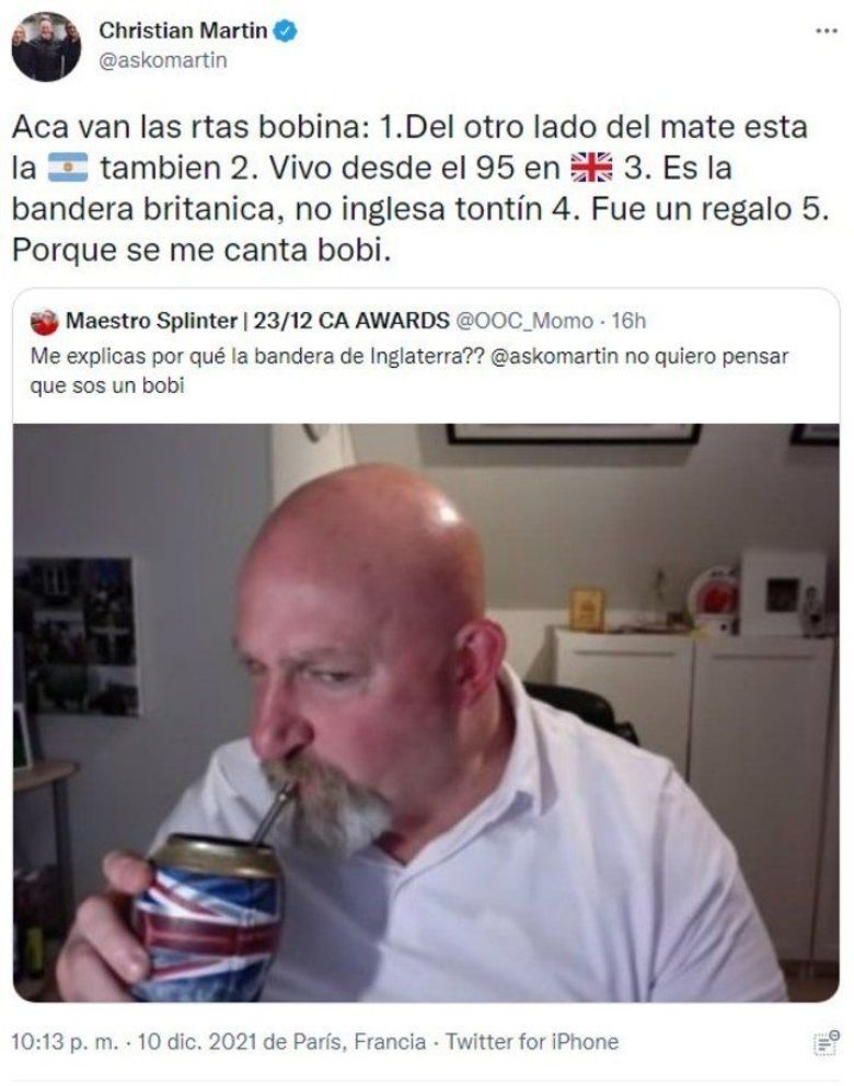 A Christian Martin le recriminaron tener un mate con la bandera británica y respondió de manera muy dura