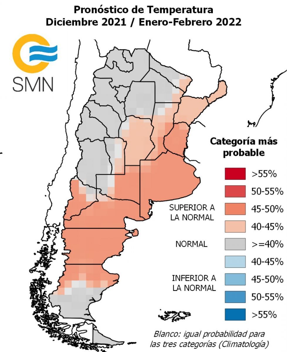 Esa condición de Niña significa que las aguas del Pacífico se encuentran más frías que lo habitual, lo que en nuestra región impacta con precipitaciones menores al promedio. Rodolfo Merlino, meteorólogo del SMN, precisó que las observaciones muestran que en diciembre, enero y febrero existe “un 40-45 % de probabilidades de que las temperaturas estén por encima de las normales. A la inversa ocurre con las precipitaciones: 40 – 45 % por debajo de las normales”.