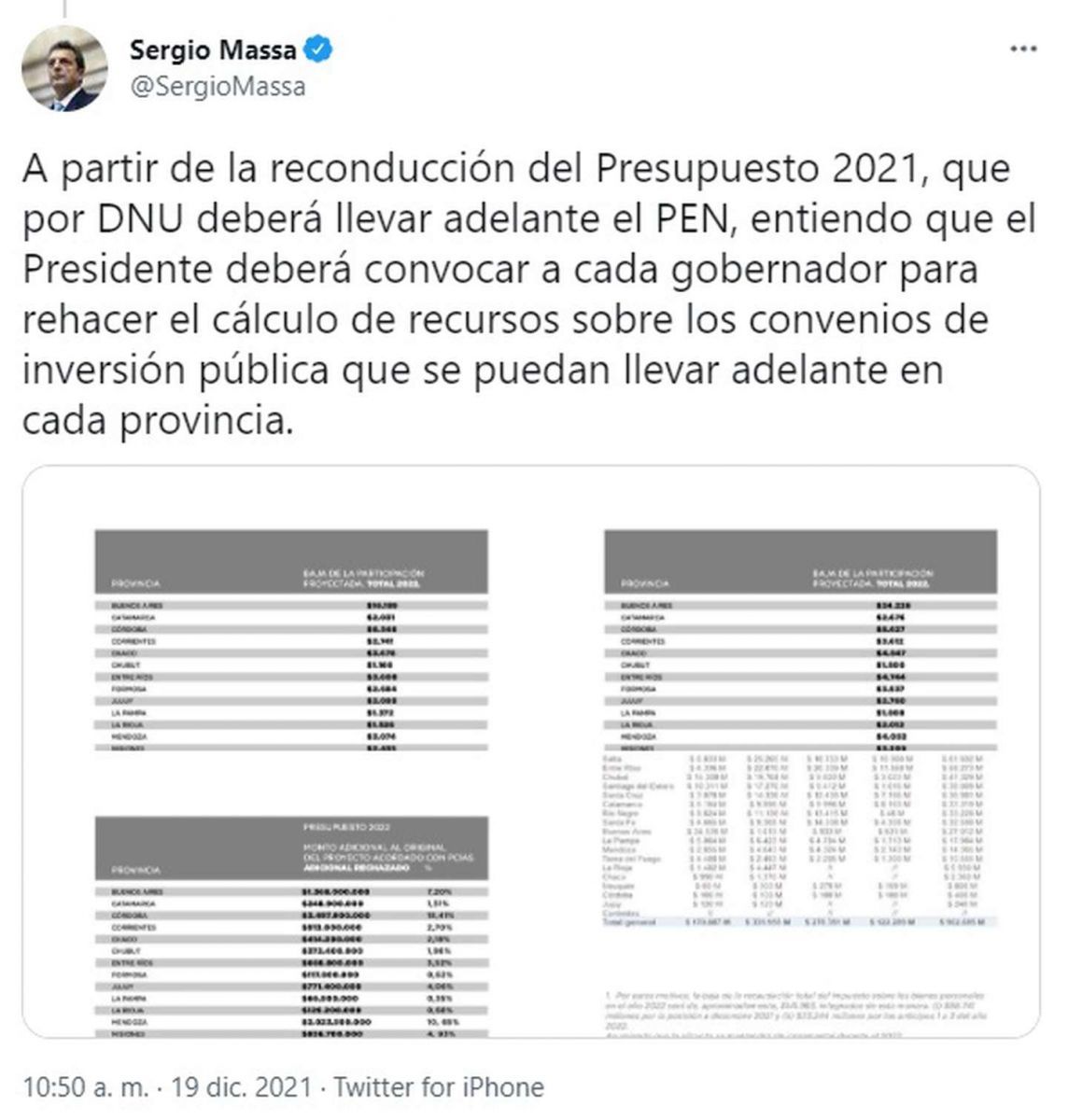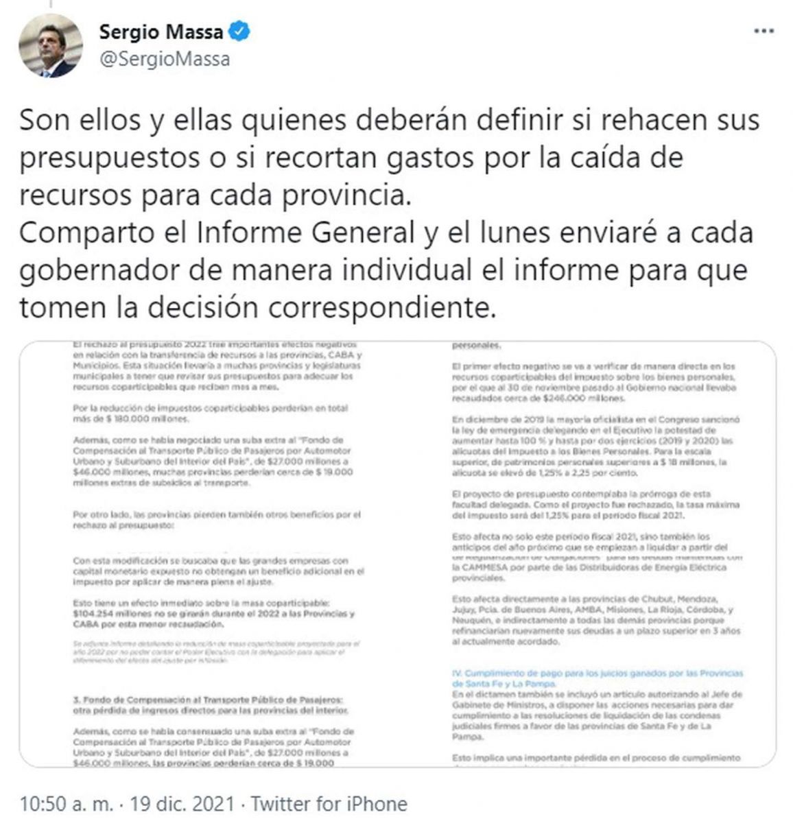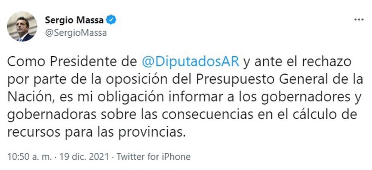 En este sentido, Massa comunicó en un hilo en Twitter que “ante el rechazo por parte de la oposición” del Presupuesto 2022 es su obligación “informar a los gobernadores y gobernadoras sobre las consecuencias en el cálculo de recursos para las provincias”. Cabe remarcar que el Presidente retuiteó los mensajes del exintendente de Tigre.