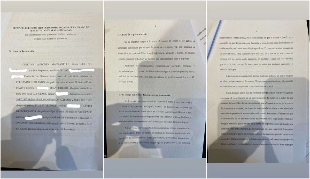 De esta manera, según se indica en el documento, con el patrocinio de Fernando Burlando, Manzanelli presentó una denuncia por los delitos de “amenazas calificadas por el uso de arma en concurso real con tentativa de homicidio en contra de Elian Ángel Valenzuela”.