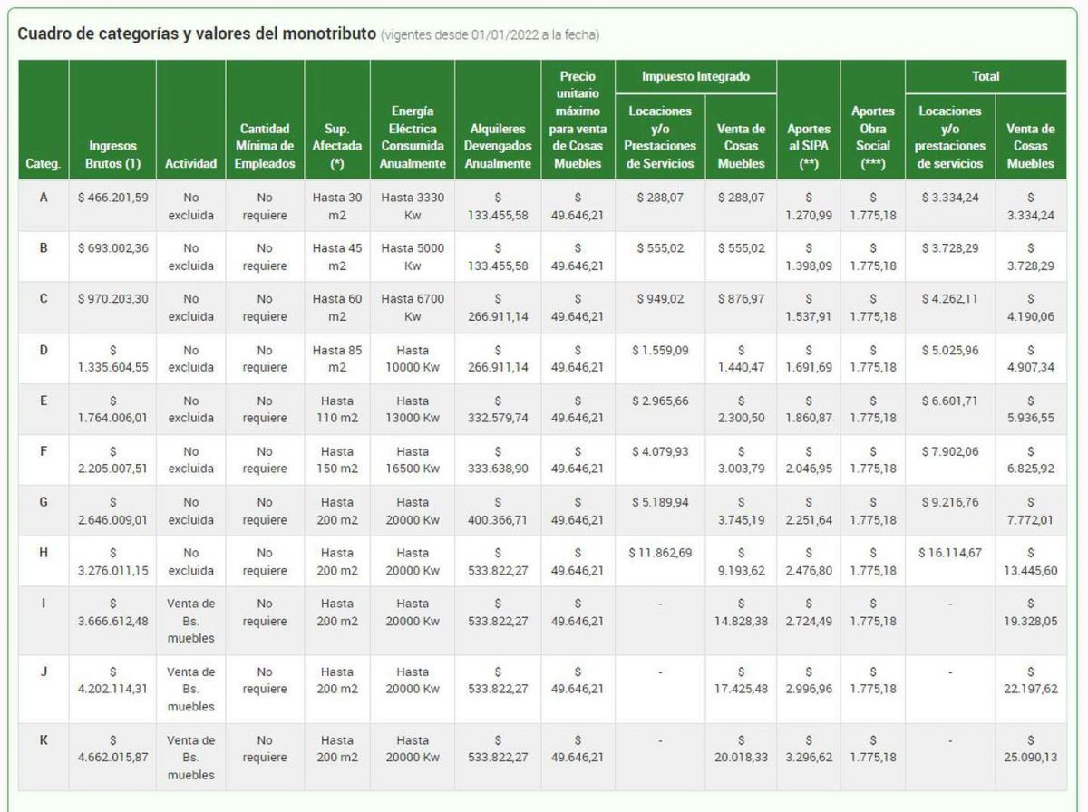 Categoría A: $3334,24 el pago mensual, con una facturación anual máxima de 466.201,59 pesos.