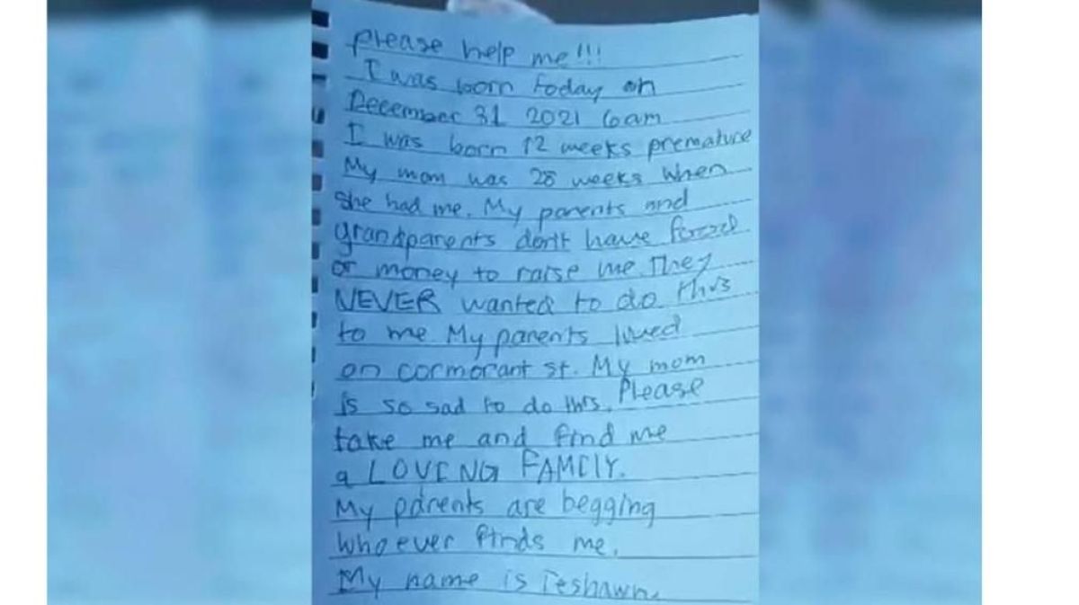 Asimismo, continuó: “Mi mamá está muy triste por hacer esto. Por favor, recójanme y búsquenme una familia amorosa. Mis padres están rogando que alguien me encuentre. Mi nombre es Teshawn”.