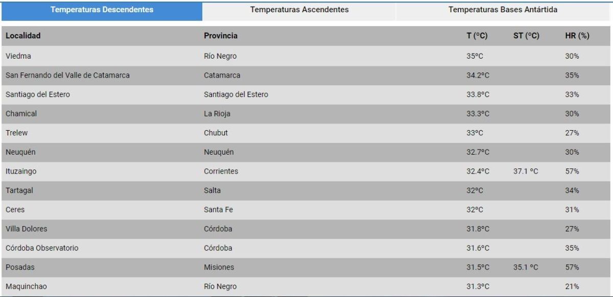 Segunda quedó San Fernando del Valle de Catamarca con 34,2°, 3° Santiago del Estero con 33,8°, 4° Chamical de La Rioja (33,3°), 5° Trelew (33°) y 6° Neuquén (32,7°).