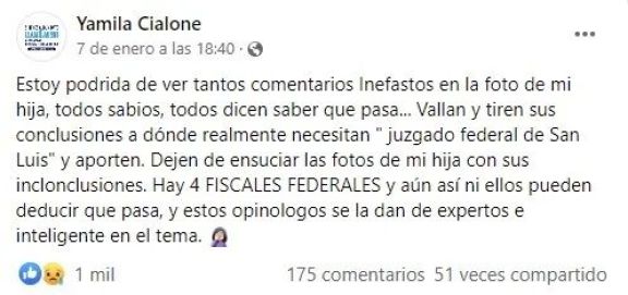 Yamila Cialone, mamá de la niña desaparecida en San Luis en junio de 2021, realizó un duro descargo a través de Facebook contra las personas que opinan del caso.