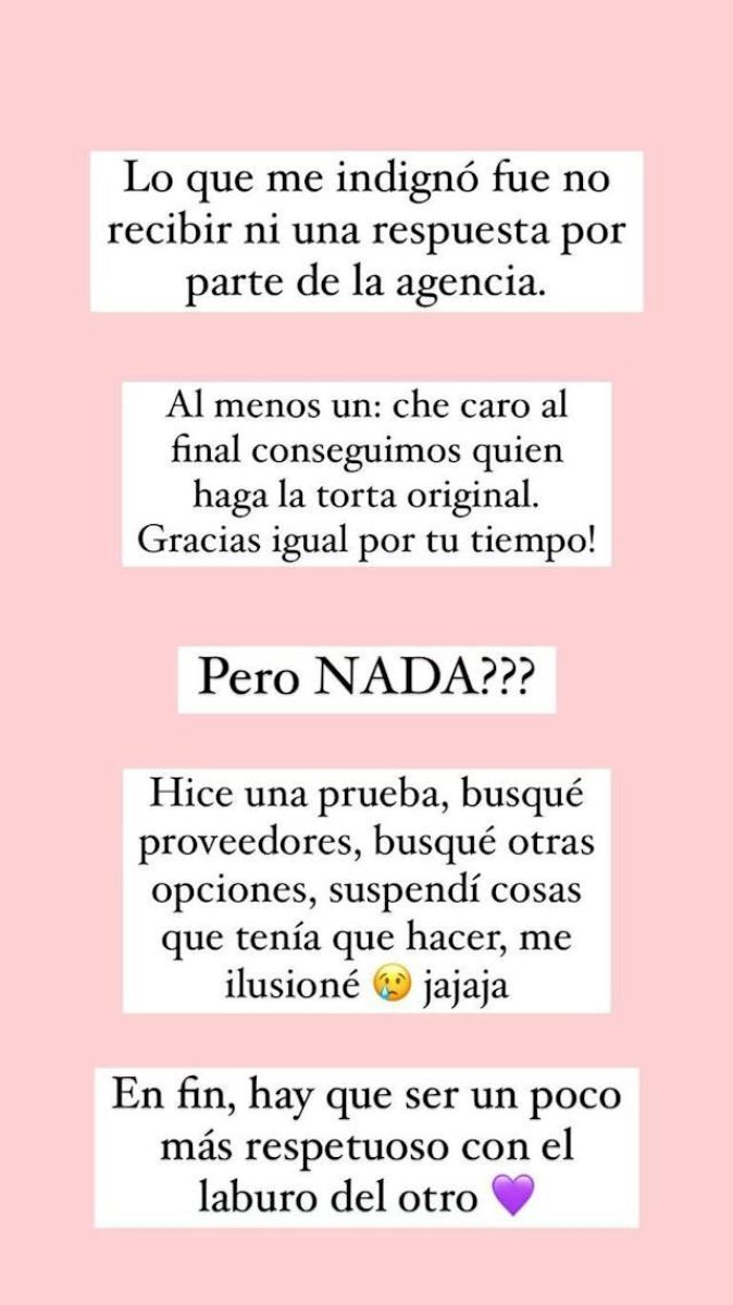 Carol contó que necesitaba una confirmación definitiva ya que no llegaba con los tiempos. “Cuando les dije que por favor necesitaba una respuesta porque si no no llegaba con los tiempos me dejaron de responder”, agregó y cerró: “No me enojo que no me la hayan pedido, para nada. Sino que era necesario un ‘gracias por tu tiempo, pero conseguimos a otra persona que la haga como ellos quieren”.