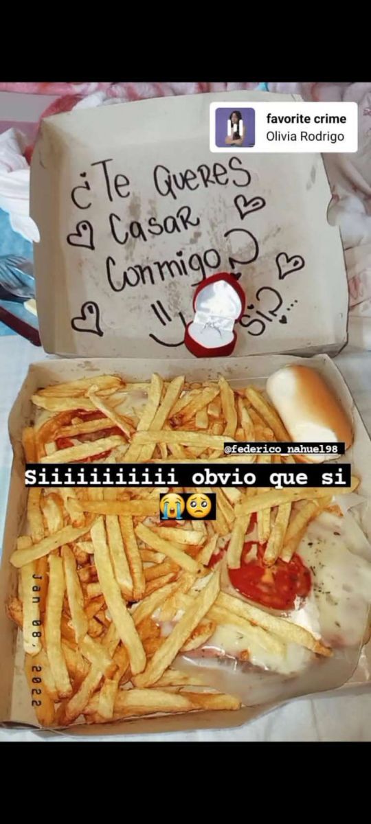 En una caja de milanesas y papas fritas: así le pidió casamiento a su novia