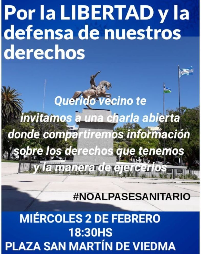 Bajo la consigna “por la libertad y en defensa de nuestros derechos”, vecinos autoconvocados de la Comarca se reunirán este miércoles a las 18:30 en la plaza San Martin de Viedma para expresar su rechazo al pase sanitario.