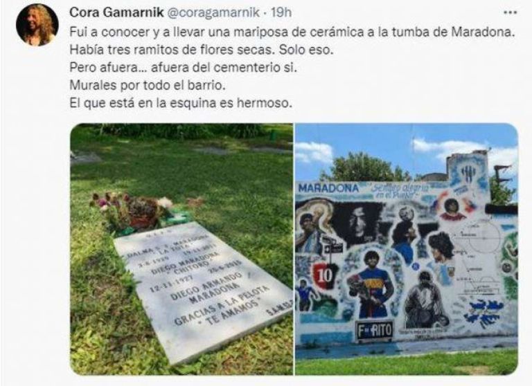 “Fui a conocer y a llevar una mariposa de cerámica a la tumba de Maradona. Había tres ramitos de flores secas. Solo eso. Pero afuera...afuera del cementerio sí. Murales por todo el barrio. El que está en la esquina es hermoso”, escribió la usuaria Cora Garmarnik en su cuenta de Twitter y acompañó el mensaje con una foto de cómo se veía el alrededor de la lápida.