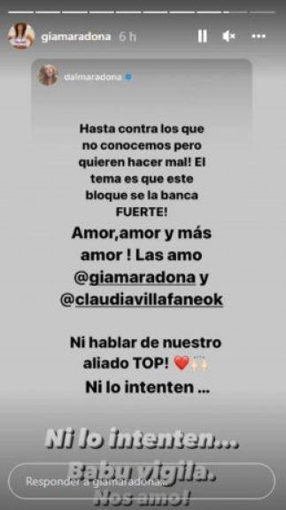 “Amor, amor, y más amor. Las amo @giamaradona y @claudiavillafaneok. Ni hablar de nuestro aliado TOP”, agregó Dalma también destacando el “top”, haciendo referencia a su padre y con los emojis de un corazón rojo y unas manos con las palmas levantadas. Y concluyó: “Ni lo intenten…”