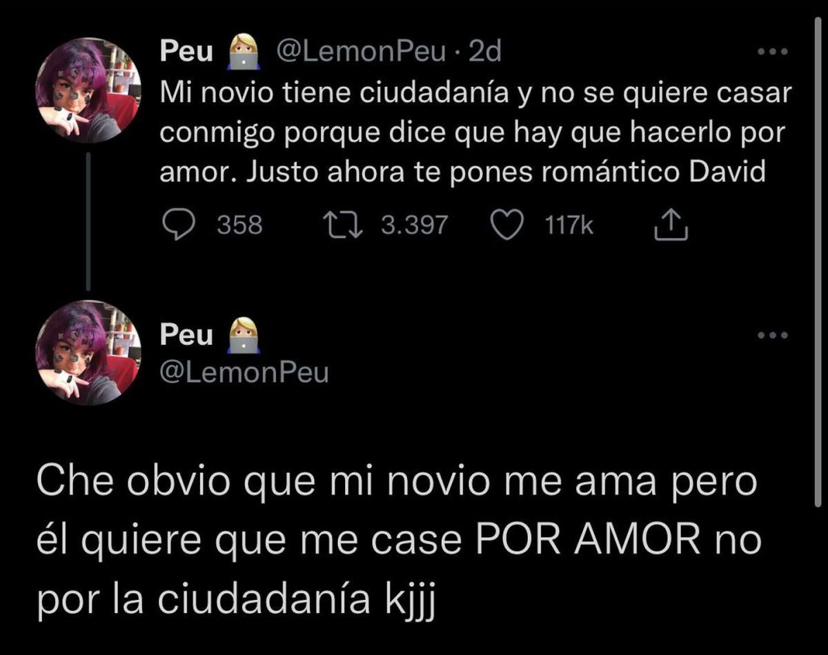 En este sentido, su publicación generó, en menos de 48 horas, más de tres mil retuits y 117 mil likes. Tras ver la catarata de comentarios que se empezaron a generar por su posteo, Paula enfatizó: “Che, obvio que mi novio me ama pero él quiere que me case por amor, no por la ciudadanía”.