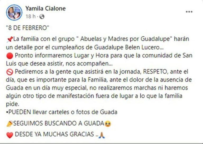 Además, pidió respeto, ya que es un día sensible para los familiares de la nena que desapareció el 14 de junio. “Pediremos a la gente que asistirá en la jornada respeto ante el día, que es importante para la familia, ante el dolor de la ausencia de Guada en un día muy especial. No realizaremos marchas ni haremos algún otro tipo de manifestación fuera de lugar a lo que la familia pide”, explicó desde su cuenta personal de Facebook.
