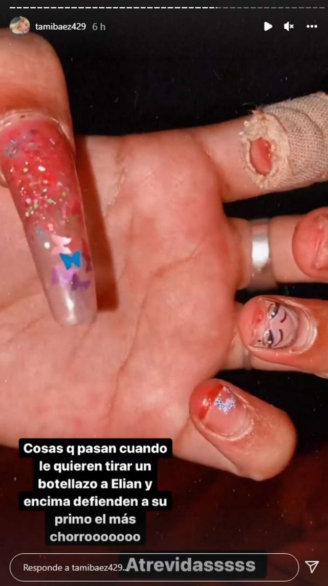 Sin embargo, la peor parte llegó cerca de la medianoche cuando compartió sus uñas rotas tras defender a su novio de una agresión. “Cosas que pasan cuando le quieren tirar un botellazo a Elián y encima defienden a su primo, el más chorro. Atrevidas”, escribió en una historia en su nuevo Instagram, junto a una foto de su mano ensangrentada y con curitas.