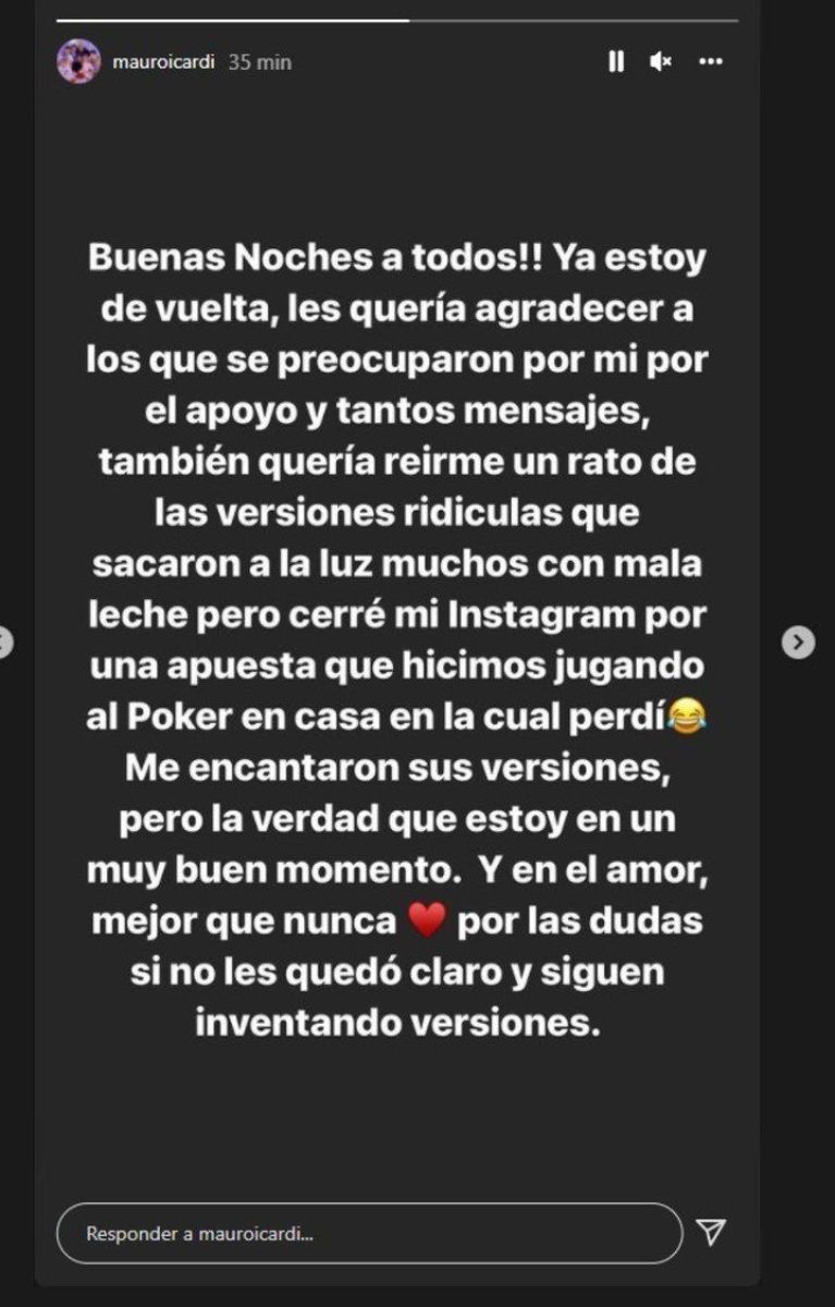 “Buenas noches a todos, ya estoy de vuelta, les quería agradecer a todos los que se preocuparon por mí por el apoyo y tantos mensajes, también quería reírme un rato de las versiones ridículas que sacaron a la luz muchos con mala leche, pero cerré mi instagram por una apuesta que hicimos jugando al póker en casa en la cual perdí”, comenzó explicando.