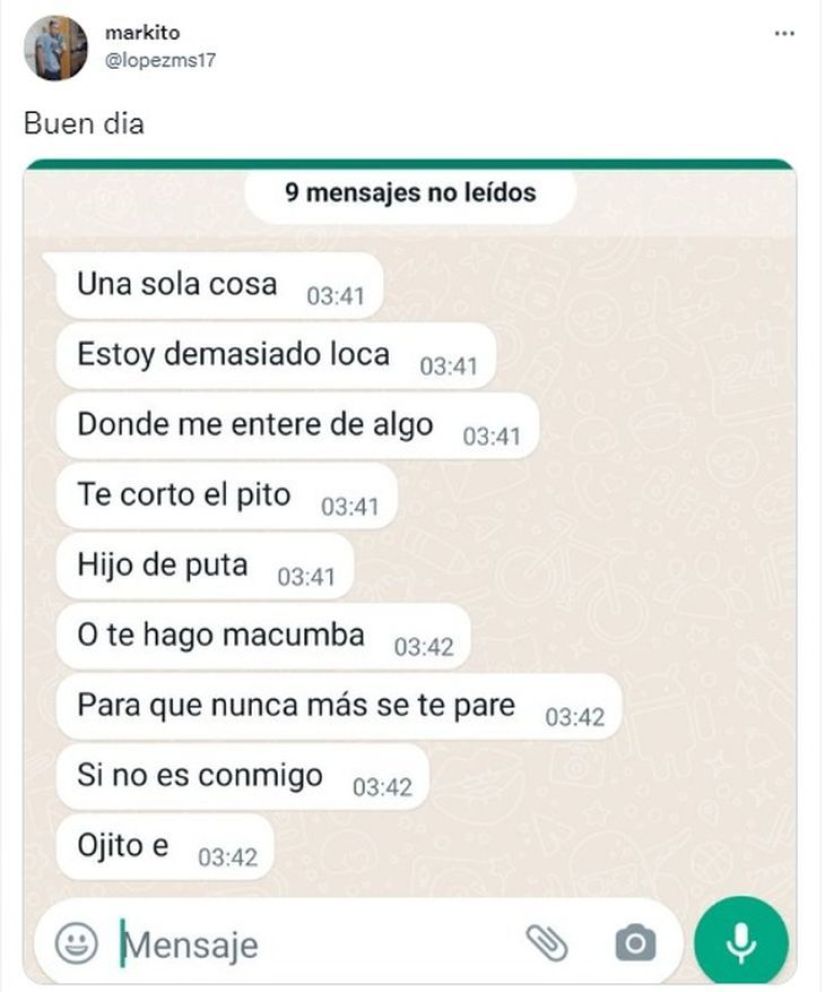 De este modo, lejos de tratarse de un mensaje amoroso por parte de su novia, la joven le advertía con muchísima violencia que “estaba demasiado loca” y que por eso, si llegaba a enterarse de que él la había engañado le iba a cortar los genitales.