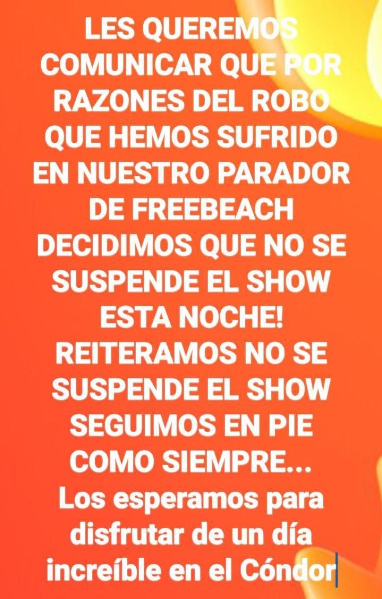 "Les queremos comunicar que por razones del robo que hemos sufrido en nuestro parador de Free Beach, decidimos que no se suspende el show de esta noche. Reiteramos, no se suspende el show, seguimos en pie como siempre", detallaron.