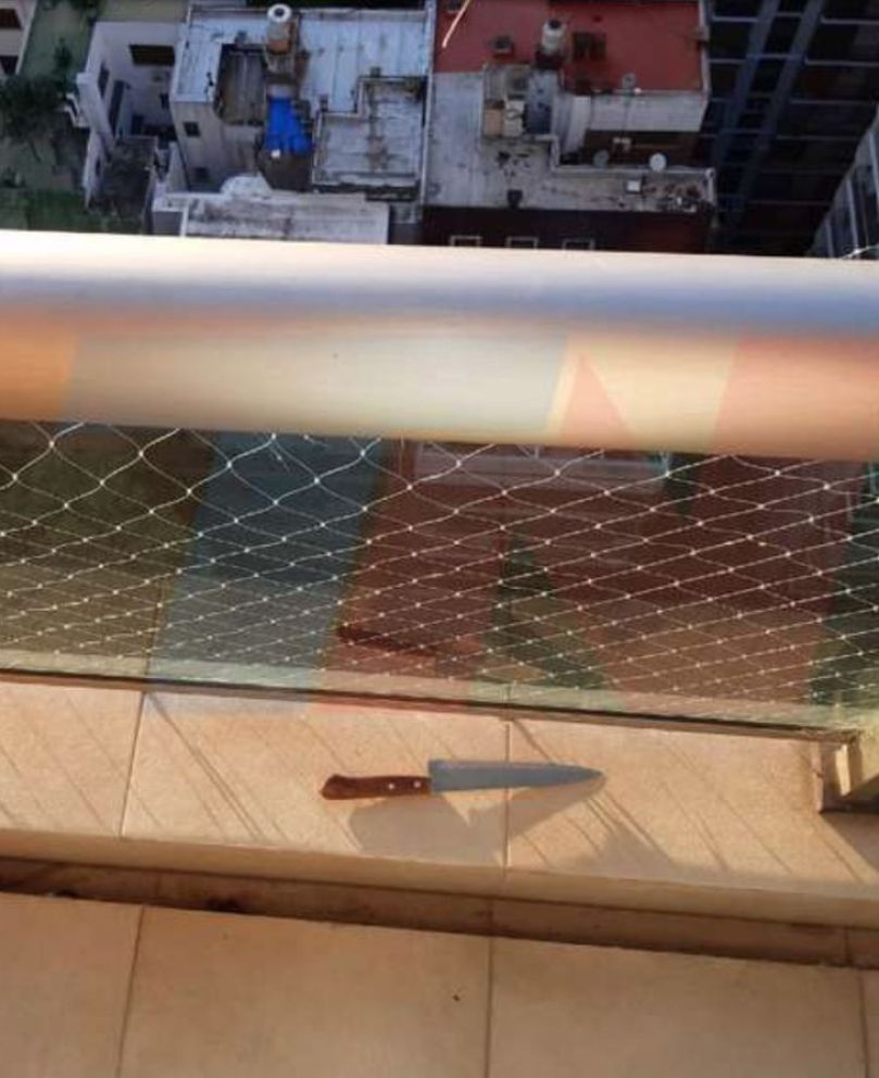 De este modo, en las imágenes se puede ver un cuchillo en el suelo y la red de contención con un agujero. Pero lo más sobresaliente es que no hay rastros de sangre ni violencia.