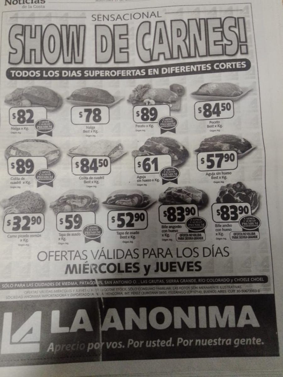 Un viejo recorte de una publicidad en el diario Noticias de la Costa trajo a la memoria mejores tiempos. Allí se pueden ver los precios de cortes de carne en la Comarca, cuando no superaban los 100 pesos.