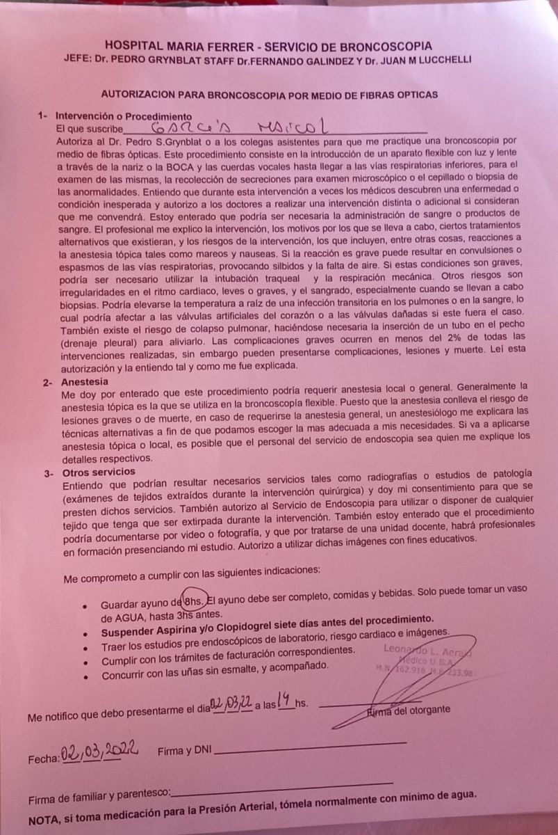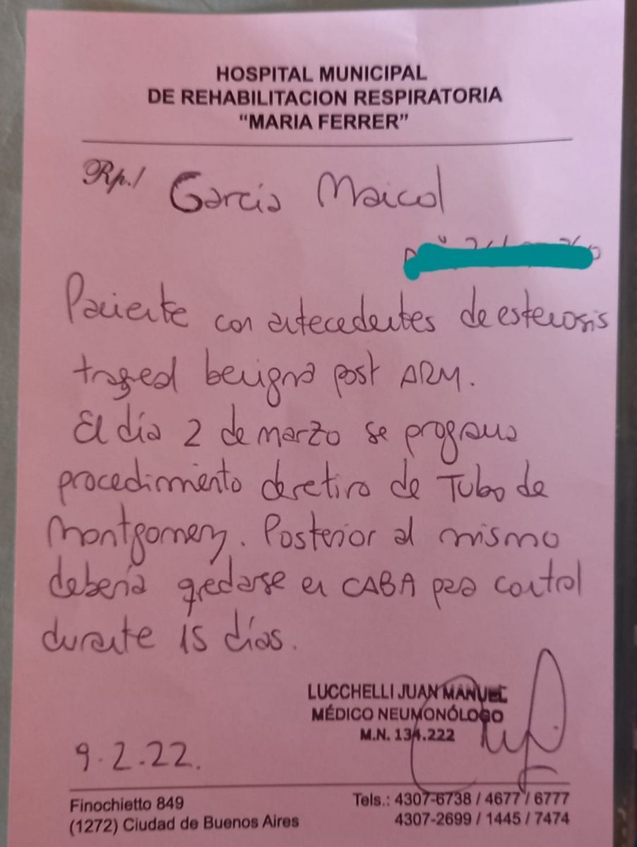 El muchacho se llama Maicol, tiene 30 años, y luego de un problema respiratorio, con los estudios de rigor correspondientes, le diagnosticaron estenosis traqueal benigna. Lo que viene ahora es un tratamiento y la cirugía que está programada para el 2 de marzo y se llevará adelante en el Hospital Municipal de Rehabilitación Respiratoria María Ferrer.