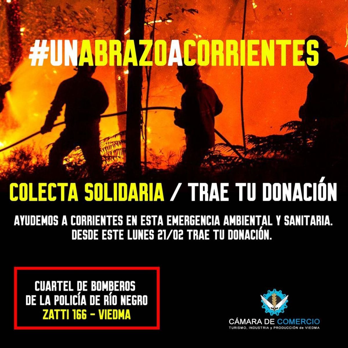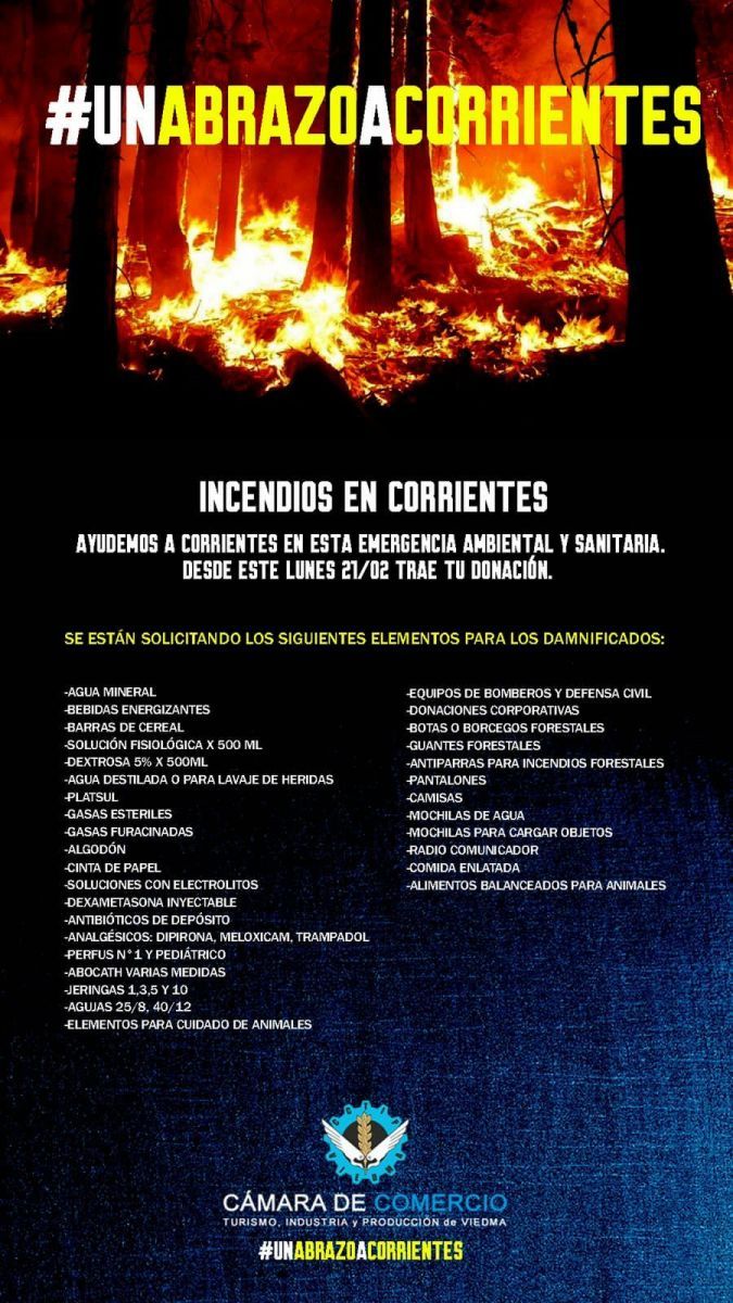 Con el hashtag #UnAbrazoaCorrientes, la Cámara de Comercio de Viedma comenzó una colecta solidaria. Desde el lugar afectado por las llamas solicitan ayuda con productos específicos que son de extrema necesidad en estos momentos.