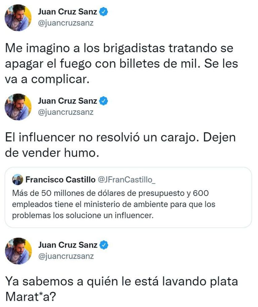 "Me imagino a los brigadistas tratando se apagar el fuego con billetes de mil. Se les va a complicar", comenzó el comunicador. Luego agregó: "Ya sabemos a quién le está lavando plata Marat*a?". Finalizó diciendo: “Ustedes crean en los reyes. A mí todo lo que rodea el asunto de los 100 palos me hace ruido. MUCHO.”