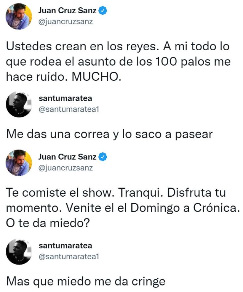 Uno de los que fue lapidario con el joven, fue el periodista de Crónica, Juan Cruz Sanz. En sus redes sociales hizo varios comentarios refiriéndose a la colecta.