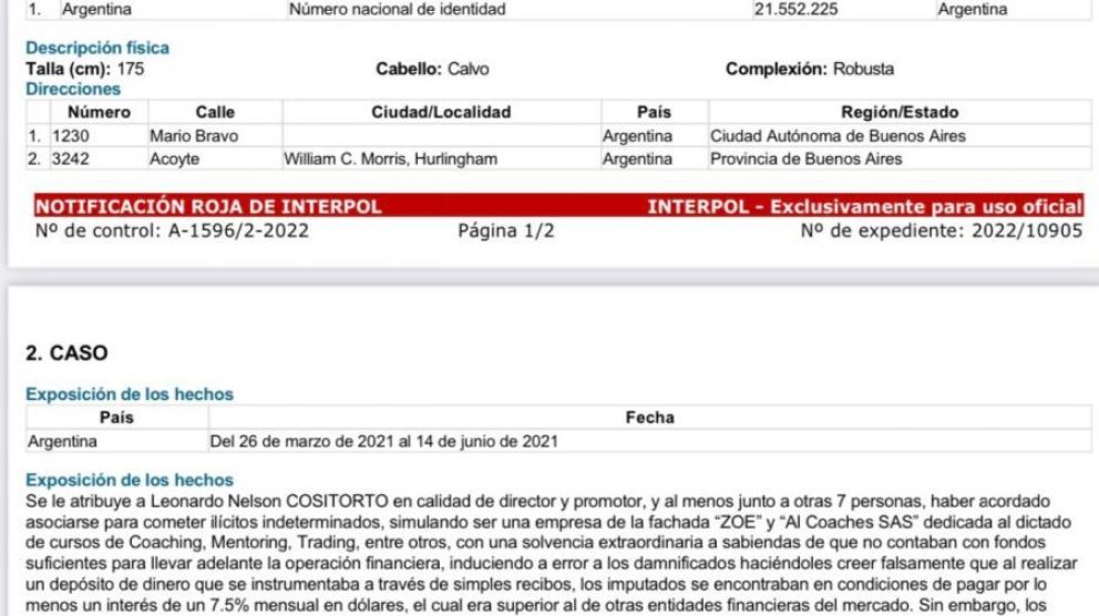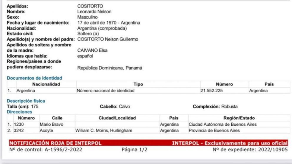 En el pedido de Interpol, se explican algunos hechos por los que se busca a Cositorto, quien el fin de semana compartió algunas transmisiones online desde República Dominicana, donde se encontraría según las distintas versiones.