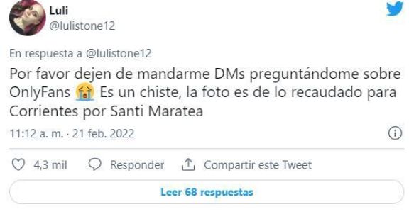 Si bien se trataba de una inocente broma, varios no lograron captarla y siguieron comentando con respecto a ellos. Entre los tweets en respuesta a la aclaración se encontraban algunos como: “No te hagas la bolud... y pasá el link”, “Aprovechá y llenate de plata”, “Ya me había emocionado, no jueges con nosotras”, “Y yo que te iba a decir que me ayudaras a emprender”, “Quizás era la señal que necesitabas para abrirte un OnlyFans si hay tantos que preguntan”.