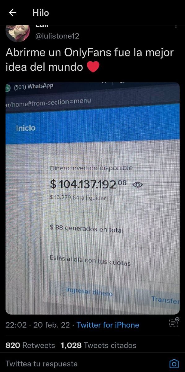 “Abrirme un OnlyFans fue la mejor idea del mundo”, escribió Luli (@lulistone12) adjuntando una captura de lo que sería el dinero que tiene en su cuenta del banco.