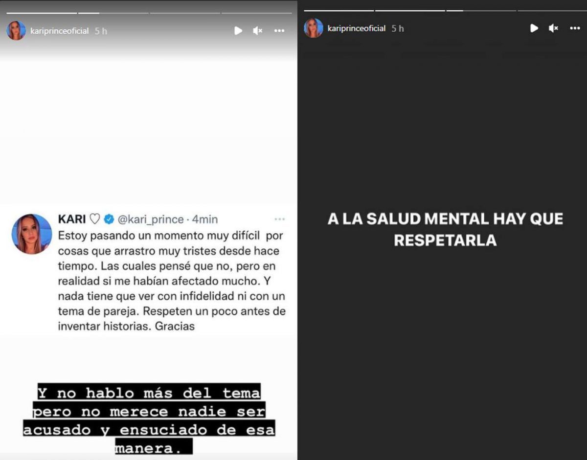 “Estoy pasando un momento muy difícil por cosas que arrastro muy tristes desde hace tiempo. Las cuales pensé que no, pero en realidad sí me habían afectado mucho”, contó Karina en las historias de la red social.