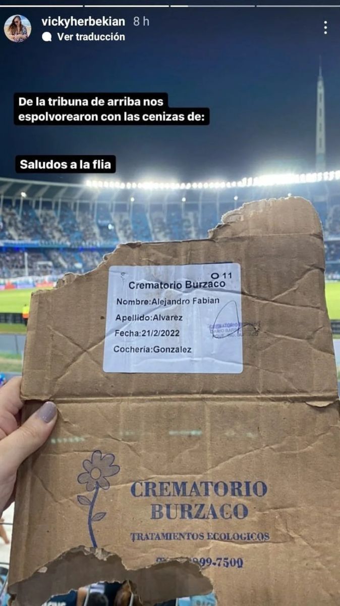 Al terminar el primer tiempo, a los hinchas les cayó desde la segunda bandeja una caja que tenía un cartel y un logo que decían: “Crematorio Burzaco, Alejandro Fabián Alvarez, 21/02/2022, cochería Gonzalez”. "Saludos a la familia", bromeó la fanática, quien además se encargó de viralizar el momento con una foto del a caja.