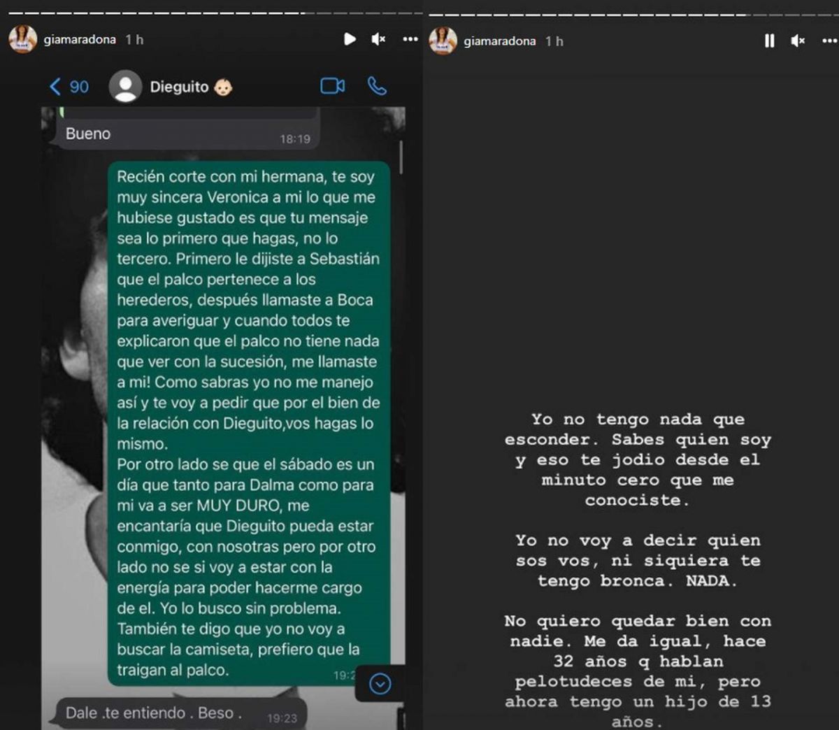 La hija del 10 publicó la captura de una conversación que mantuvo con Mario Baudry, actual novio de Ojeda, para dejar en claro que las cosas entre ellas estaban mal.