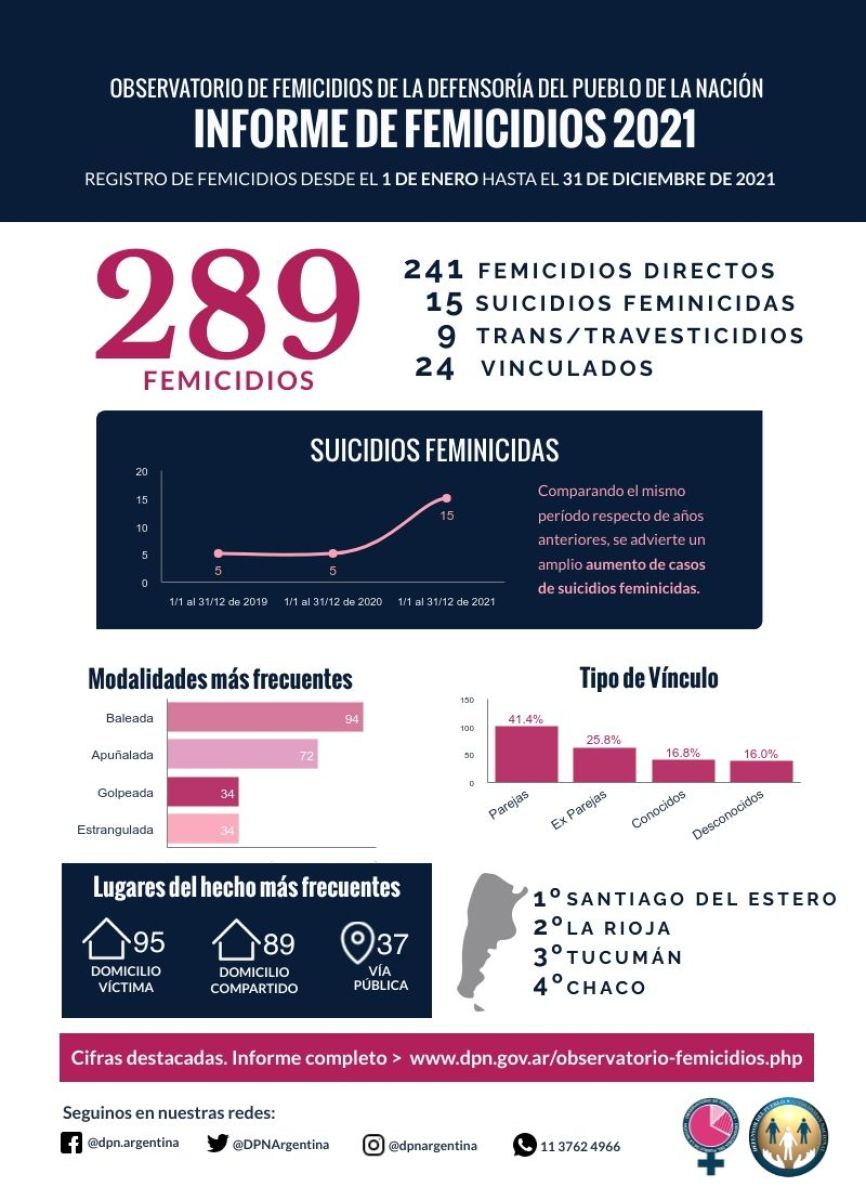 Se dio a conocer un nuevo informe del Observatorio de Femicidios de la Defensoría del Pueblo de la Nación (OFDPN) y reveló que, en todo 2021, se registraron 289 femicidios, entre ellos 24 vinculados y 9 transfemicidios, lo que promedia un crimen cada 30 horas. En el 57 por ciento de los casos el asesino era la pareja o expareja de la víctima.