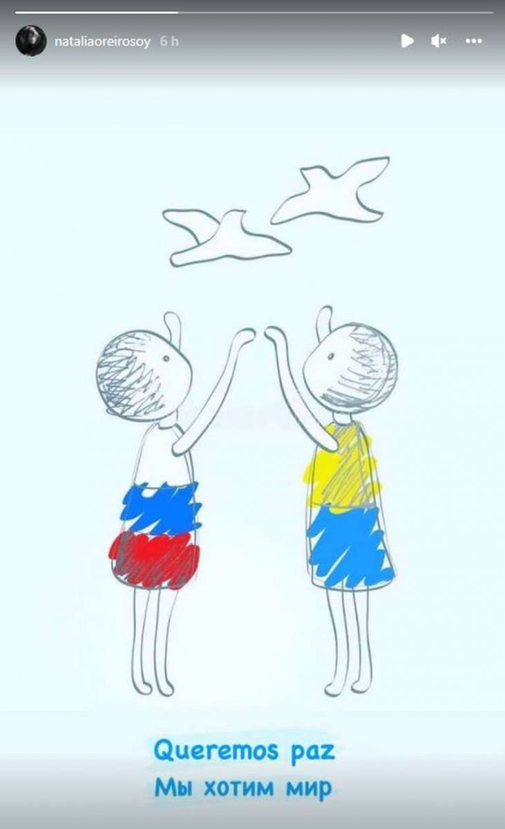En una historia de Instagram, Oreiro compartió un dibujo de dos nenas que dejan volar dos palomas blancas. Una tiene los colores de la bandera rusa y la otra, los de Ucrania.