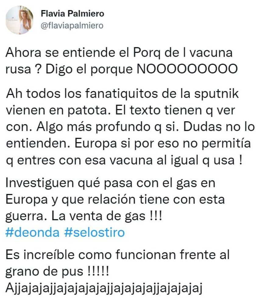 "Ahora se entiende el por qué de la vacuna rusa? Digo el porque NOOOOOOOOO", escribió en la red social Twitter, a lo que los usuarios no tardaron en responder. Frente a la gran catarata de comentarios negativos, la actriz no dudó en defender su postura y explicar lo que había querido decir.