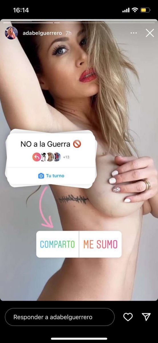 La bailarina decidió sumarse a la iniciativa “No a la guerra”. Bajo ese tag compartió una foto donde se la ve posando de perfil completamente desnuda, mientras se cubre los pechos con las manos  y una encuesta con las opciones “Comparto” y “Me sumo” como consigna para sus seguidores.