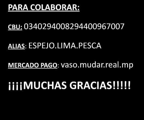 Para los interesados, su CBU es: 03402994008294400967007 y el alias: ESPEJO.LIMA.PESCA. También se puede ayudar a través de MercadoPago, con el alias: VASO.MUDAR.REAL.MP