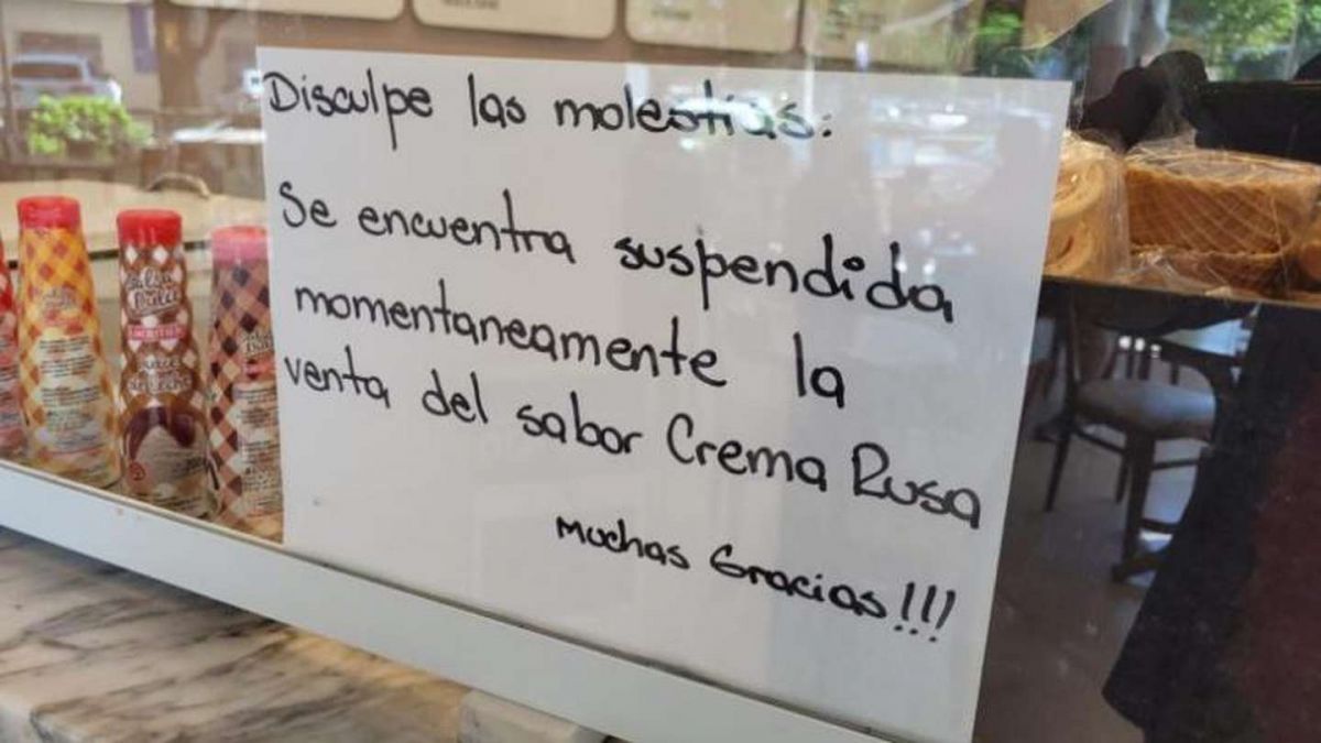 De este modo, puso un cartel en la puerta de la heladería que dice lo siguiente: “Disculpen las molestias: queda suspendida la venta de crema rusa. Mucha gracias”.