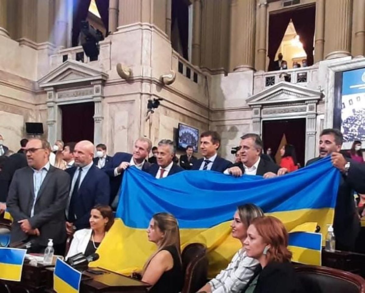 El diputado nacional libertario y diputados de Juntos por el Cambio arribaron al Congreso de la Nación con una bandera de Ucrania.