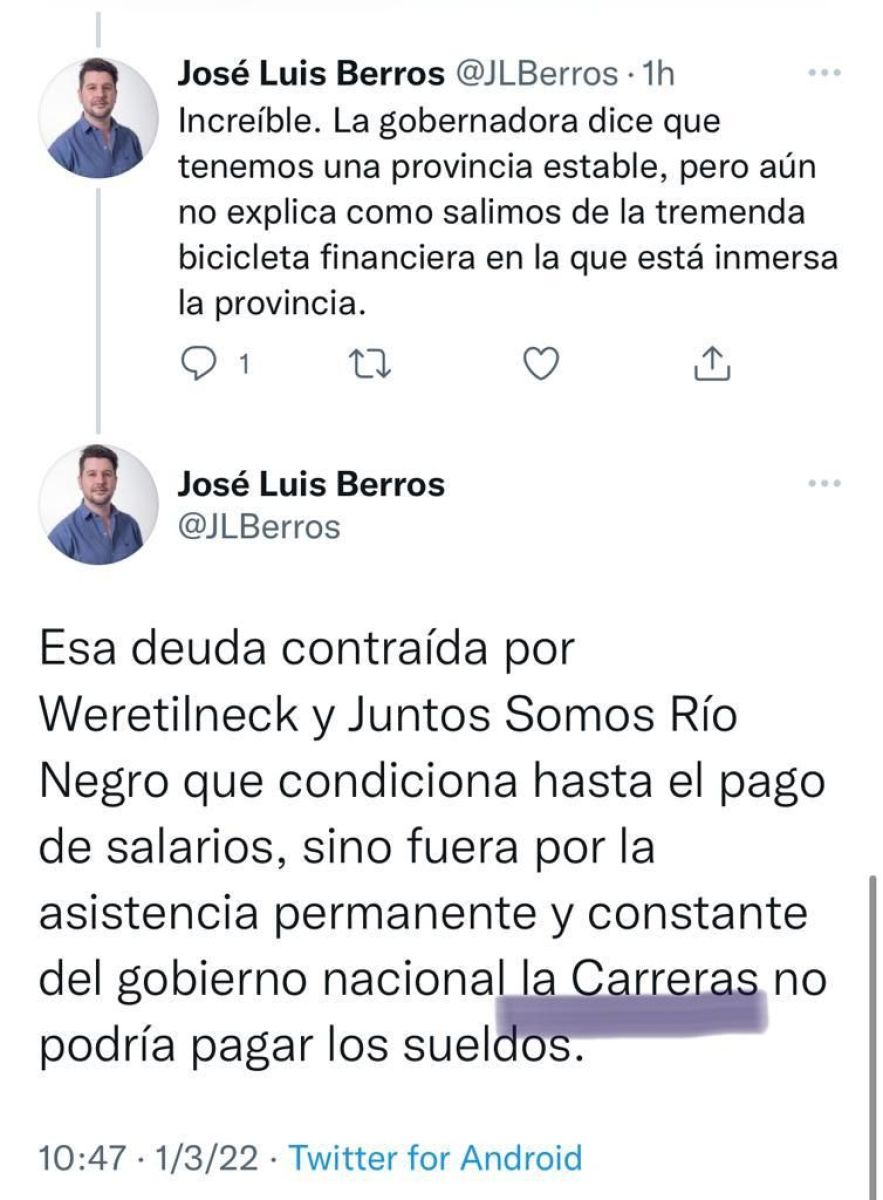 El roquense José Luis Berros dijo: “Increíble. La gobernadora dice que tenemos una provincia estable, pero aún no explica cómo salimos de la tremenda bicicleta financiera en la que está inmersa la provincia”.